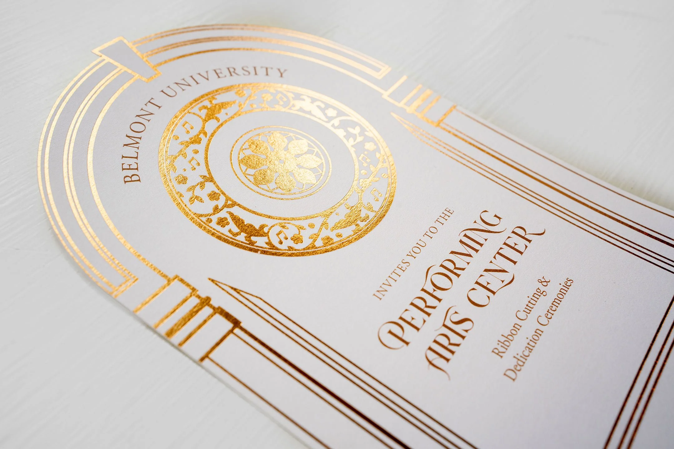 OVERVIEW:This invitation invites recipients to attend the ribbon cutting and dedication of the new Fisher Center for the Performing Arts at Belmont University, opening fall of 2021. The invite design was inspired by the uniquely stunning architecture and interior design of the building. The front of the invite uses gold foil to match the cooper dome on top of the Performing Arts Center. The intricate design work echos arches and design elements seen throughout the inside of the venue. The back of the invite includes a custom illustration that shows off the building’s exterior.
